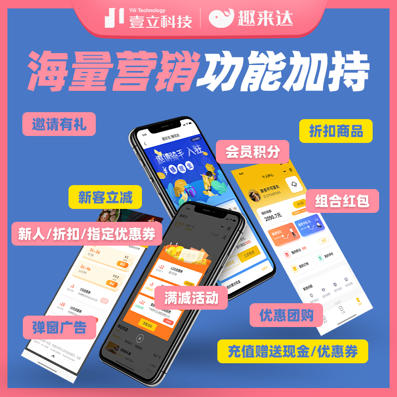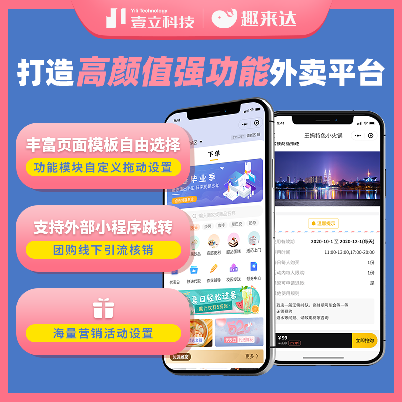 为外卖平台、跑腿公司、创业团队定制小程序与公众号两类用户入口,易推广、易传播,高颜值UI,多场景自定义配置,丰富的营销功能,满足不同题材生活平台的个性化需求。