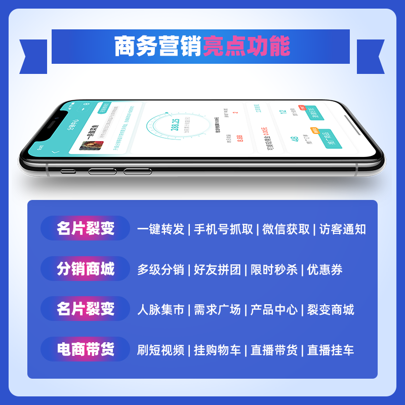 营销传播裂变。分销、预约、激励客户参与卖货,人人销售;