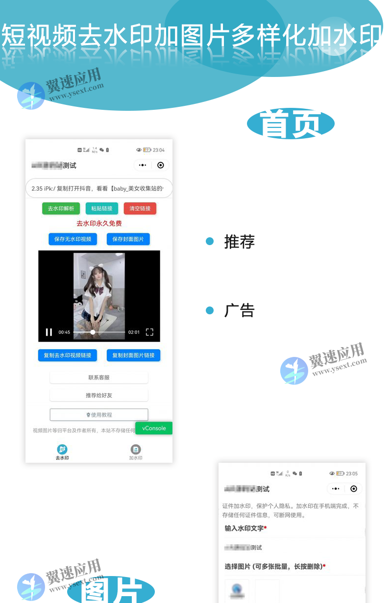 简约短视频去水印加图片多样化加水印微信小程序源码,支持一键粘贴去除各大平台的短视频水印、支持保存无水印短视频、支持保存无水印封面和一键复制文案;另外支持多样化的图片加水印功能各种自定义、安装搭建简单,另外支持流量主。
