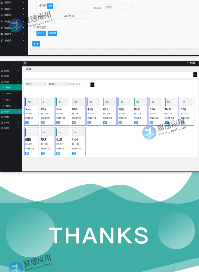 会员营销、查看房价、数据统计、客房服务、物品租借、夜审设置、系统设置