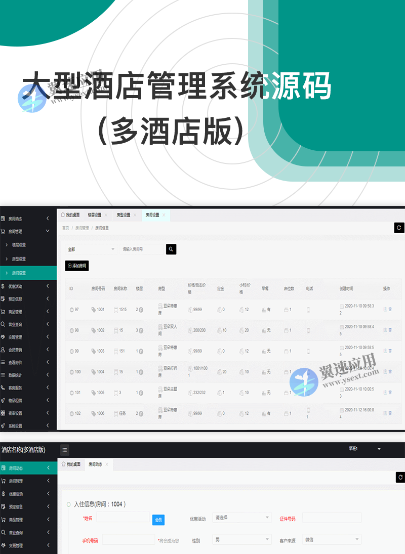 房间动态、房间管理、优惠活动、预定信息、商品管理、营业查询、交班管理