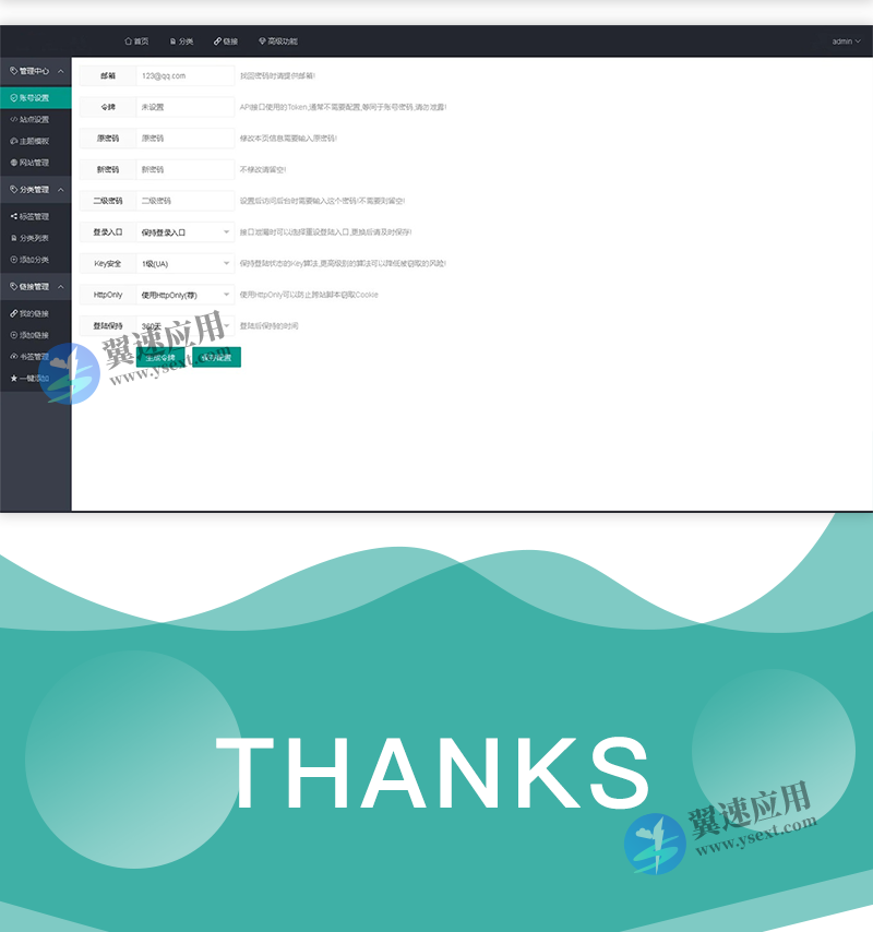 支持多用户、支持隐藏登陆入口和注册入口、支持登陆保护机制、支持二级密码、支持静态库离线和CDN加速、支持非根目录运行、支持分类选择字体图标