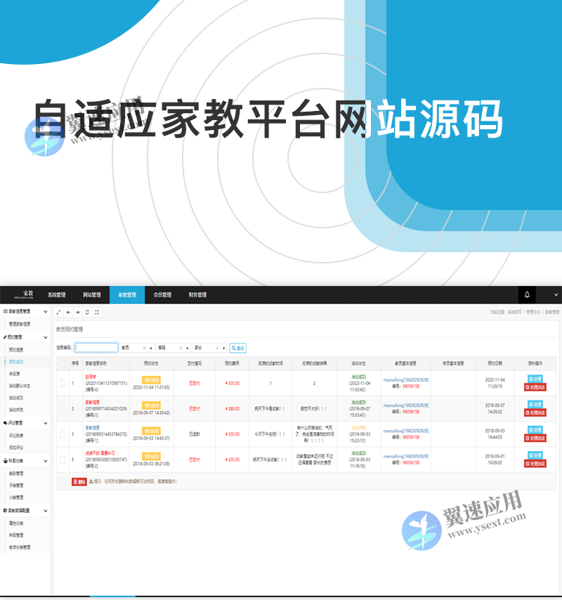教员预约管理:家教信息名称、预约状态、支付情况、预约费用、反馈的试教时间、