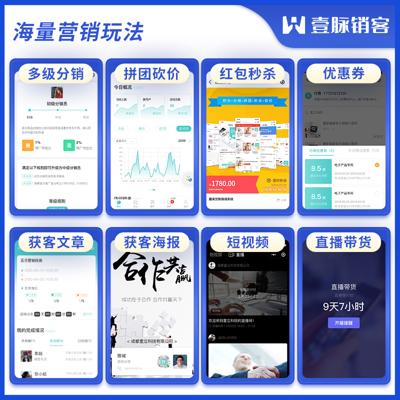 营销传播裂变。分销、预约、激励客户参与卖货,人人销售;